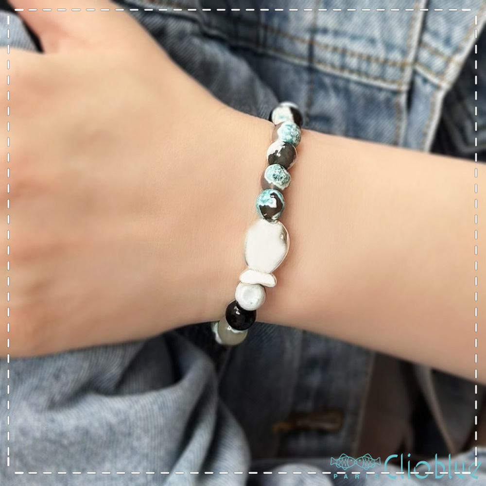 特選的藍色火焰瑪瑙/橘色火焰瑪瑙搭配純銀小魚,展現高級質感.
