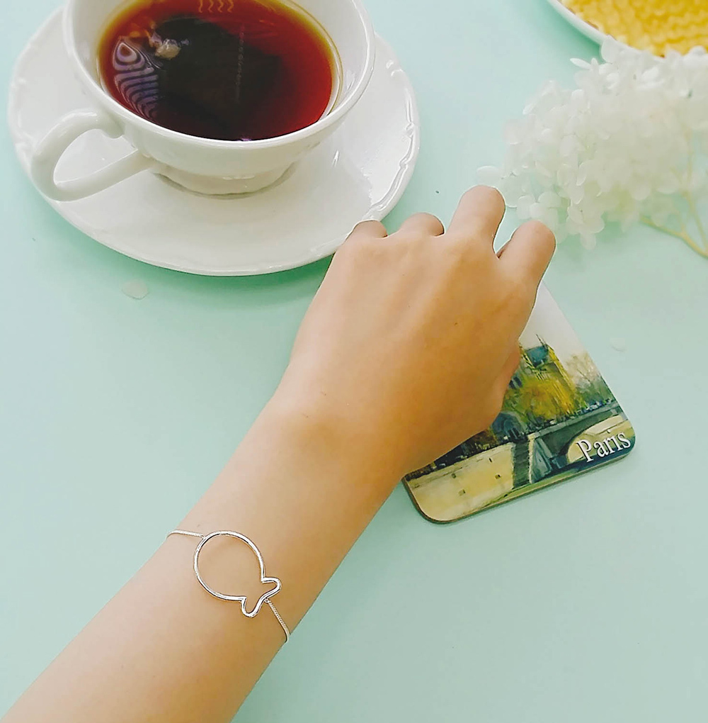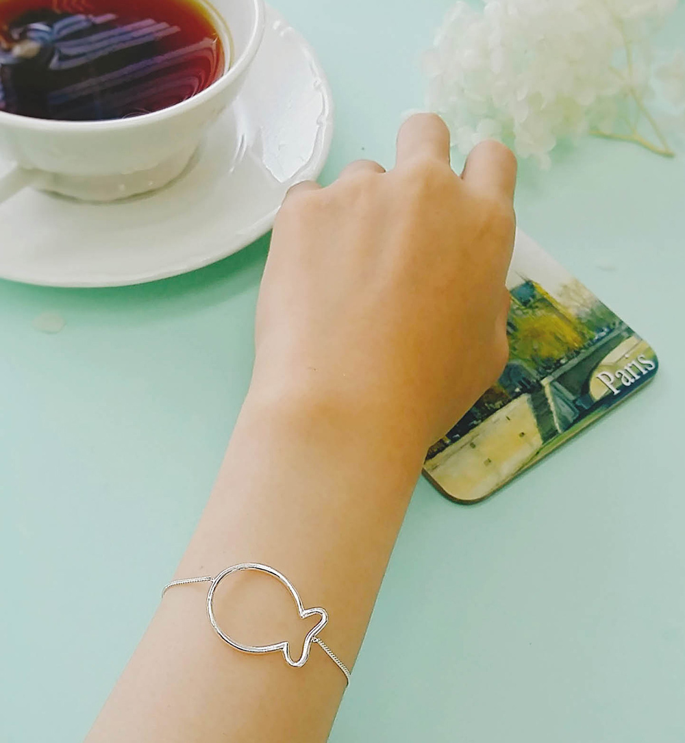 用大小適中的銀線,勾勒出魚的形狀,這款稱為影子魚的手鍊跳脫了傳統的設計.是另一種小魚選擇.