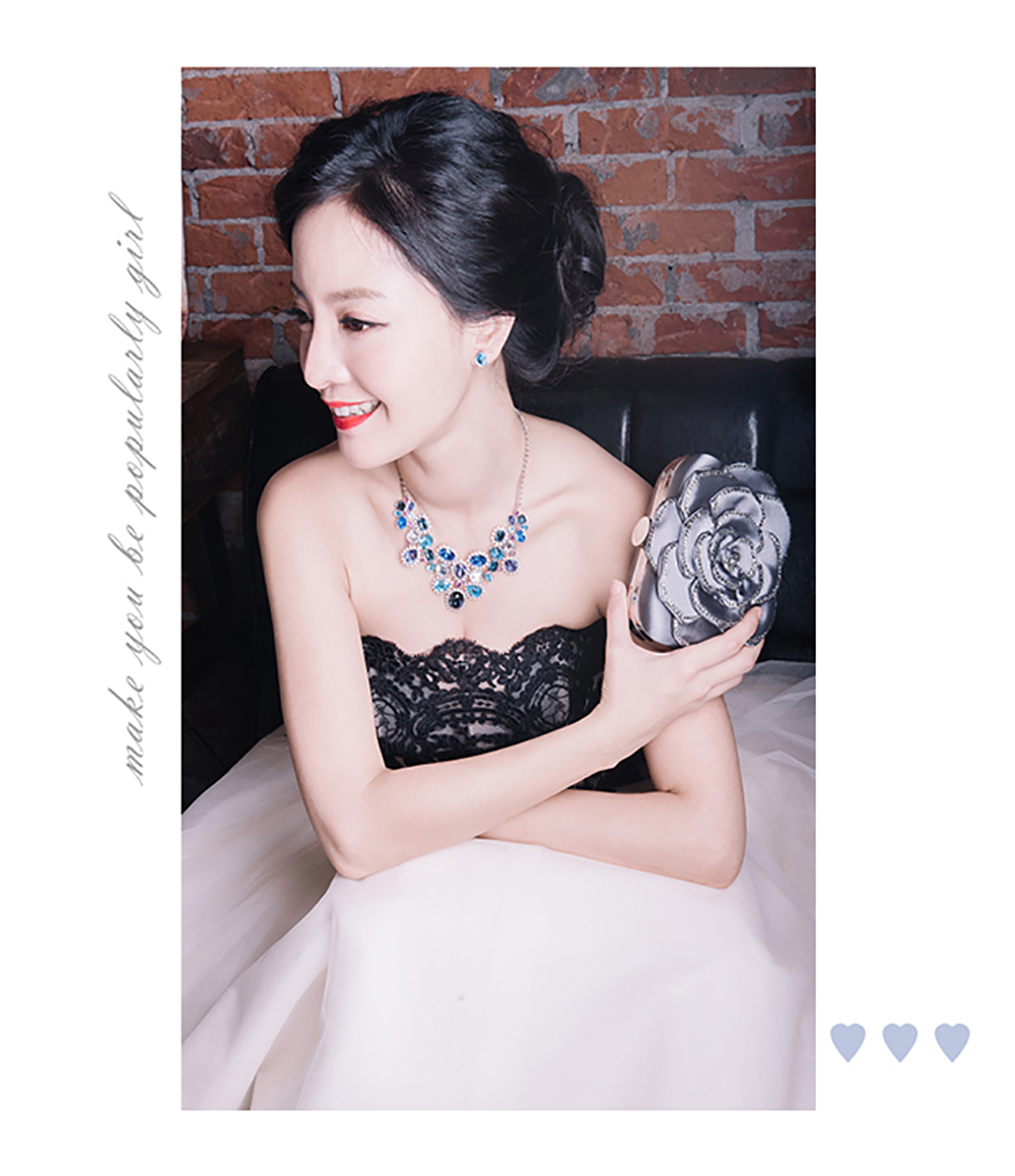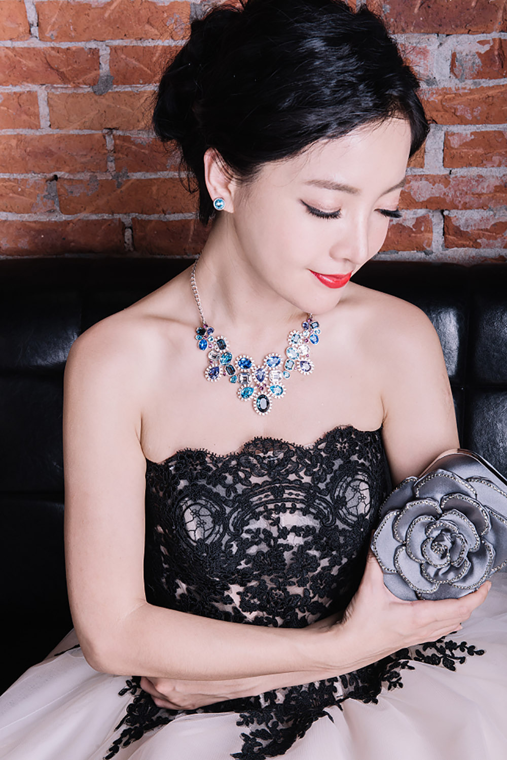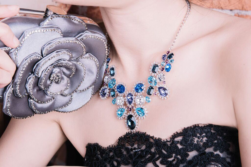 設計師運用了優雅的冷色調,將各種美麗的寶石工法切割的水晶巧妙的結合一起