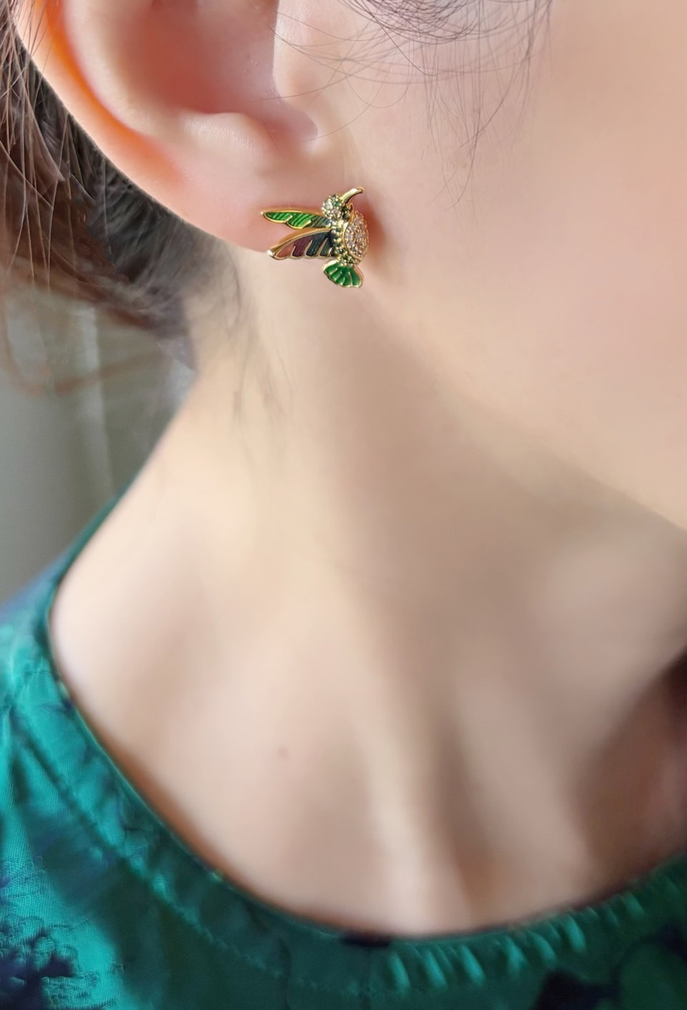精緻的蜂鳥立體造型,運用不同色調的琺瑯做翅膀,較寬的圓爪鑲妝點在身上的羽腹線,更顯立體與精細做工.