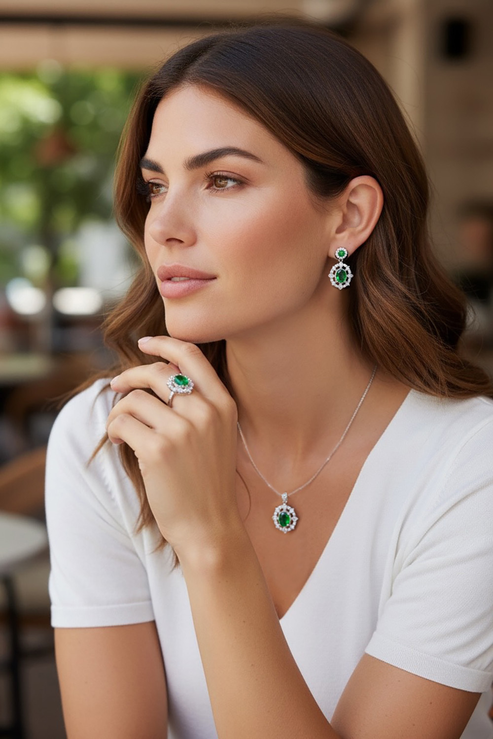 復古優雅的經典造型,這款維多利亞時期的浪漫主義風格的耳環,搭配綠寶石色的橢圓鋯石,更顯氣質與提亮膚色.