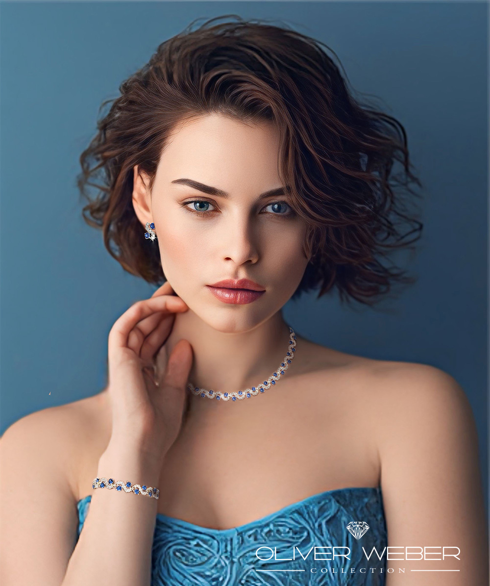 波光粼粼的S線條金屬串接,再搭配藍寶石色水晶,高貴迷人的頸鍊設計,萬般優雅的款式.