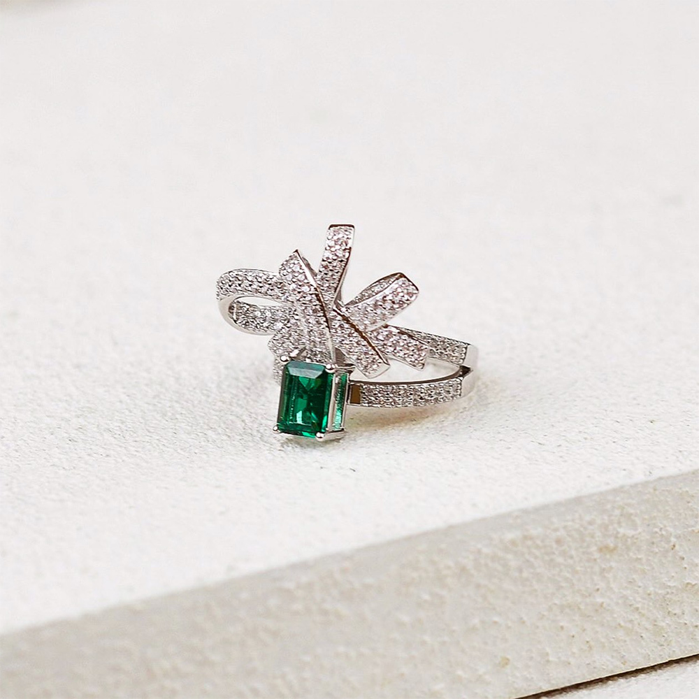 採用高級珠寶的工法,使鋯石平整有序的爪鑲工法,再鑲以祖母綠切割長型綠鋯石,完美呈現優雅傳承的造型.
