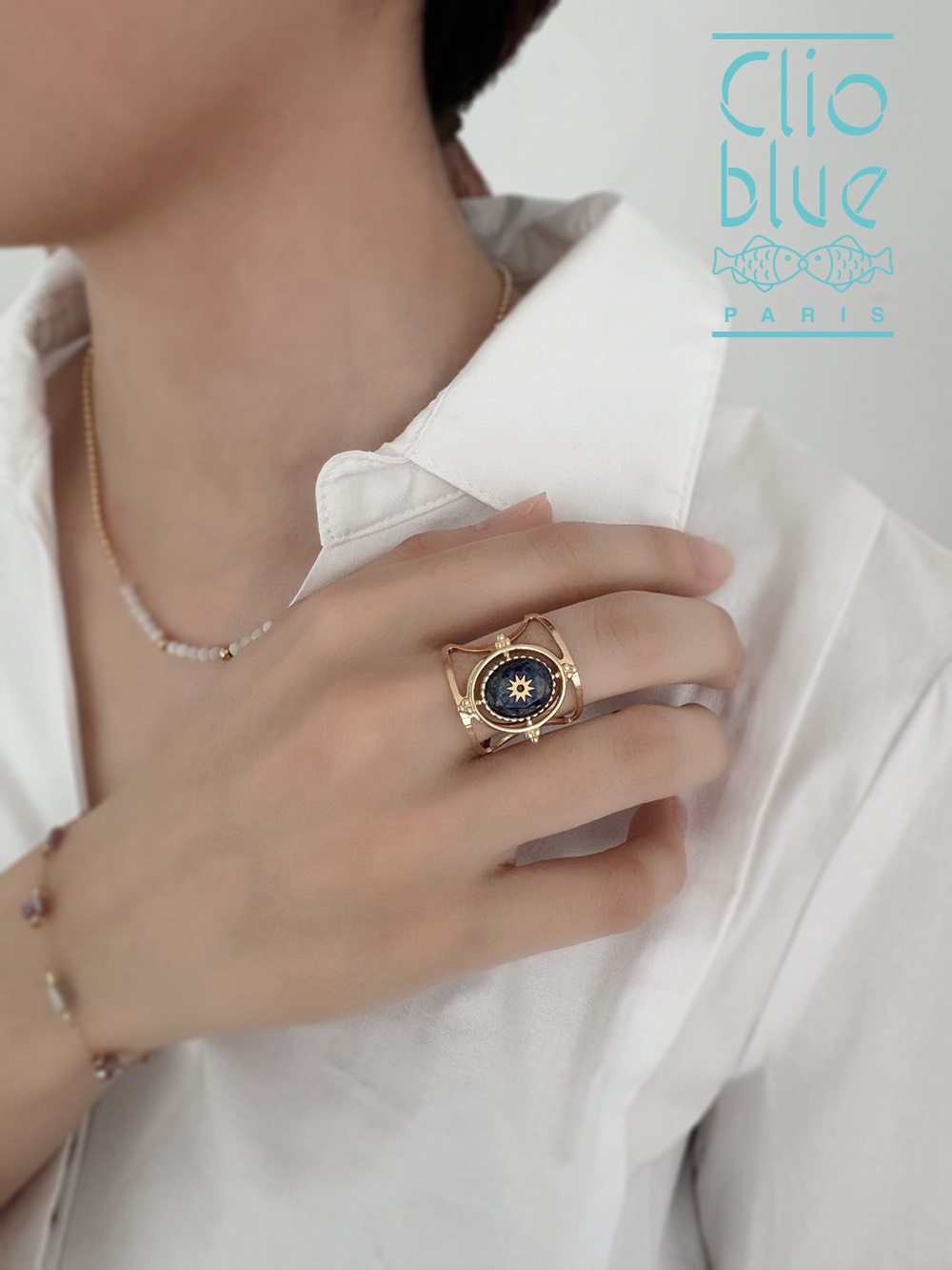非常獨特的線條,運用了非常具有神秘穿越感的造型搭配青金石,在石頭的中間還有一個星星,活動式戒圍適合各種尺寸,喜歡造型特殊又充滿星際感的朋友非常值得收藏這款戒指